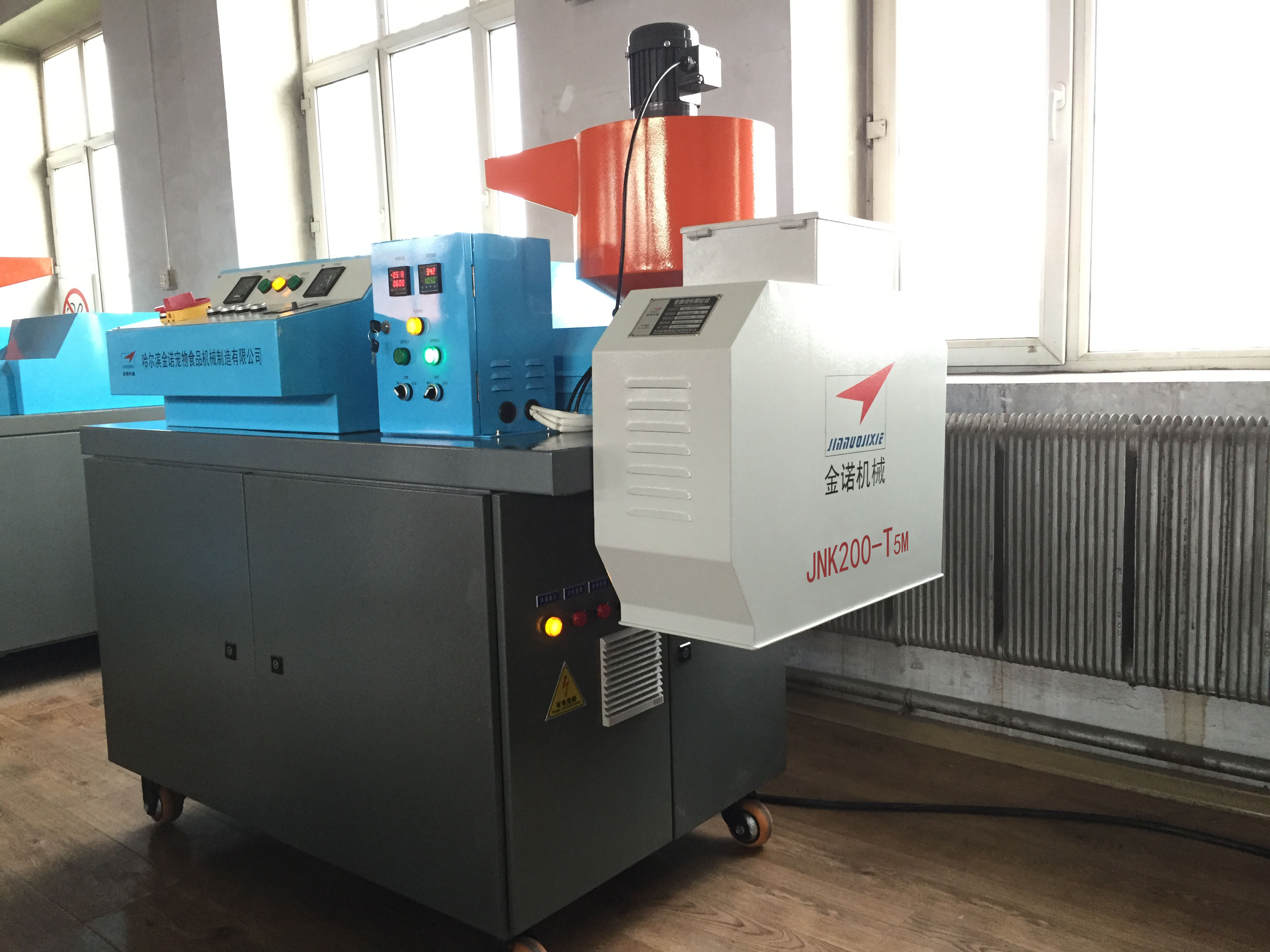 狗糧加工設備JNK200-T5M:1。JNK200-T5M型狗糧加工設備安裝方便、出廠已經(jīng)試機,狗糧機切刀采用直角切刀技術,調(diào)試簡單;2。狗糧設備的主軸和切刀小軸均可隨時注入耐高溫潤滑脂,延長狗糧機的軸承使用壽命;3。JNK200-T5M狗糧設備每小時生產(chǎn)狗糧顆粒200公斤。